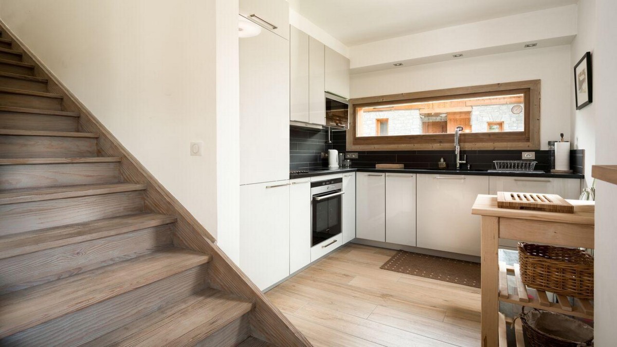 Im Erdgeschoss befindet sich ein geräumiger, offener Wohnbereich, der nahtlos in die Terrasse übergeht. Dies ist der ideale Ort, um die Nachmittagssonne zu genießen oder vor dem Abendessen einen Drink unter dem Sternenhimmel zu sich zu nehmen. Der Wohnbereich mit seinem knisternden Kamin bietet einen warmen und einladenden Ort, an dem man sich nach einem Tag auf der Piste versammeln kann. Lassen Sie sich in die weichen blauen Sofas fallen und entspannen Sie sich mit Ihren Liebsten. Große Fenster und Schiebetüren durchfluten den Raum mit natürlichem Licht und bringen die Schönheit der Natur herein. Die voll ausgestattete Küche sorgt dafür, dass alle Ihre kulinarischen Bedürfnisse erfüllt werden, egal ob Sie ein herzhaftes Frühstück zubereiten oder sich am großen Esstisch ein köstliches Abendessen mit einem guten französischen Wein gönnen.