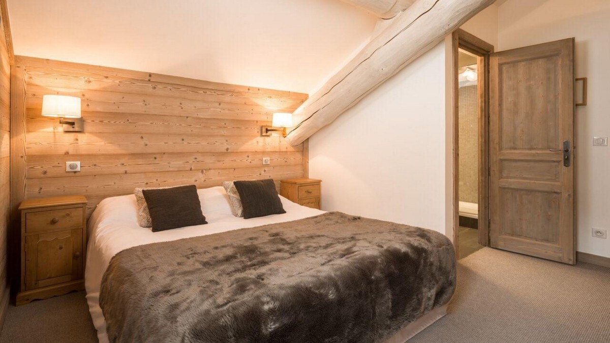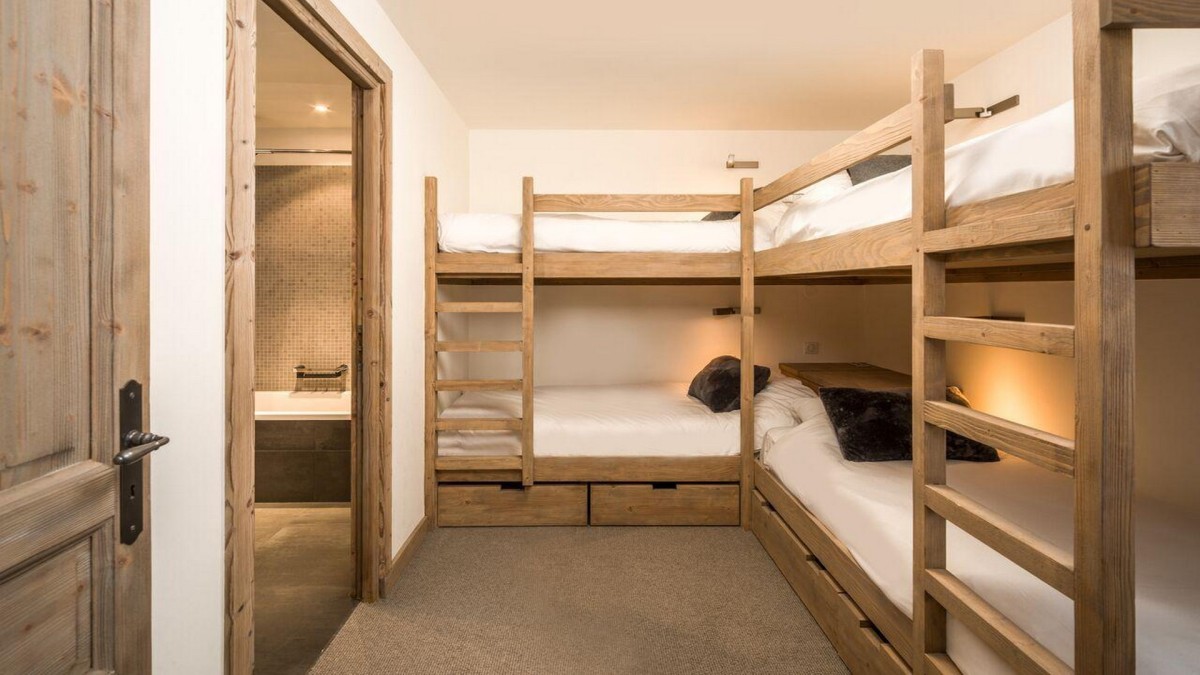Die Schlafräume des Chalets sind auf zwei Etagen verteilt, was für mehr Privatsphäre und Komfort sorgt. Im Obergeschoss erwartet Sie das Hauptschlafzimmer mit eigenem Bad für eine erholsame Nachtruhe. Auf dieser Etage befindet sich auch ein weiteres Doppelzimmer, das bei Bedarf in zwei Einzelbetten umgewandelt werden kann. Im Erdgeschoss finden Sie ein weiteres Doppel-/Zweibettzimmer mit eigenem Bad sowie das Vierbettzimmer mit Etagenbetten und eigenem Bad, das sowohl für Erwachsene als auch für Kinder geeignet ist. Jedes Schlafzimmer ist sorgfältig mit Holzvertäfelungen und warmen, erdigen Farbtönen gestaltet, wodurch eine gemütliche alpine Atmosphäre entsteht.