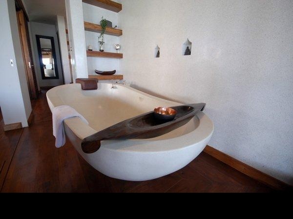 The next pavilion also has some exceptional features. The first entrance leads into a shower room for when you’re coming in from the beach or pool. A corridor from there takes you to a dressing area and separate toilet. The main room has a double bed, comfortable seating area and ceiling mounted flat screen TV. One side of the room has heavy sliding wooden doors which open to reveal twin sinks and a large terrazzo bath tub; from which you can enjoy the views out to sea. Beyond this room is a terrace that leads to a thatched Sala.