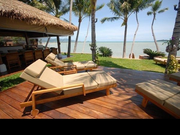 The Sala on this side of the pool provides an outdoor lounge area with sturdy wooden outdoor furniture and directly in front of this is the white sandy beach.